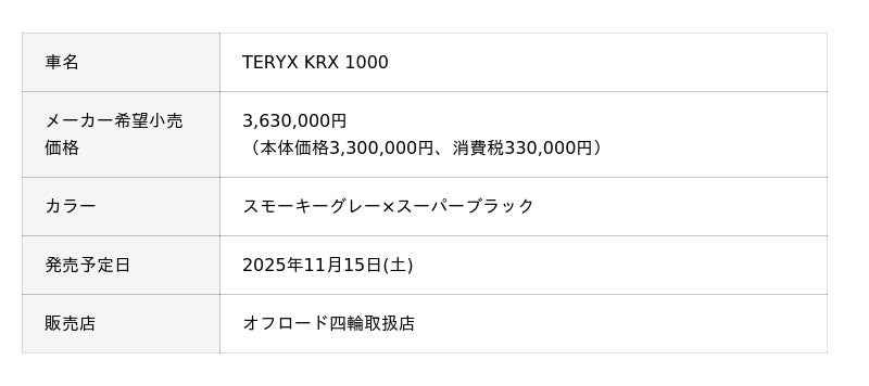 株式会社カワサキモータースジャパン(本社:兵庫県明石市、代表取締役社長:佐伯 健児)は、「TERYX KRX 1000」のカラー&グラフィック等を変更し、2025年11月15日(土)に発売いたします。