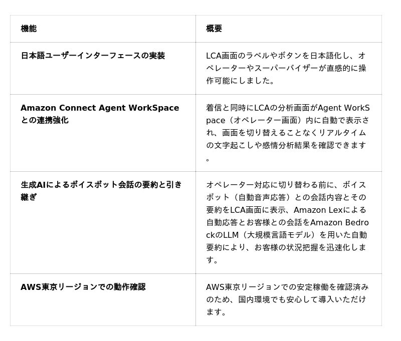 今回は、従来のLCAの機能に加え、コンタクトセンターでの利便性向上を鑑み、以下の機能開発・検証を行いました。