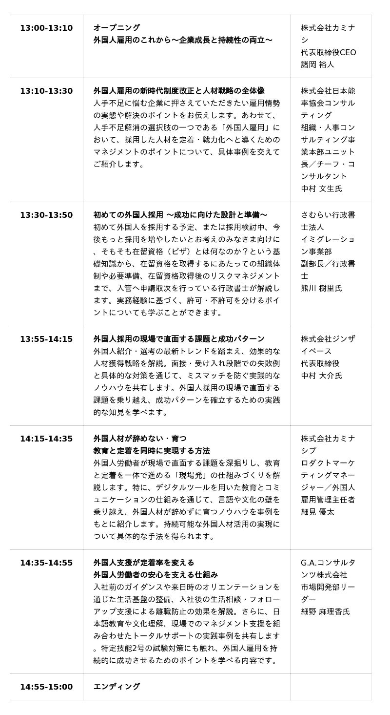 - カンファレンス名:「外国人雇用カンファレンス2025 『変わるルール』と『企業戦略』」- 開催日時 :2025年11月18日(火) 13:00~15:00- 開催場所 :オンライン- 参加費 :無料(事前申込制。申込者に参加用URLをメールにてお送りします)- 主催 :株式会社カミナシ- イベント詳細・参加申込URL: