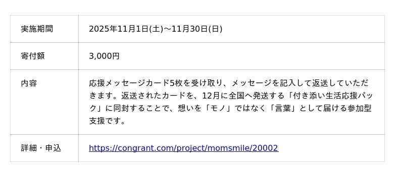 ~寄付とメッセージカードで誰でも支援に参加できる仕組みを新設個人の想いを届ける「参加型支援」開始で支える仲間を増やす~