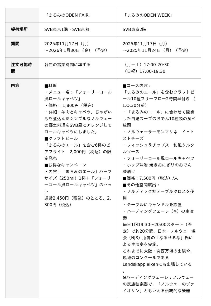 冬限定商品「SPRING VALLEY BREWERY まろみのエール(期間限定)(以下、まろみのエール)」(350ml缶)を12月2日(火)より全国発売(※1)することを記念して、SVB東京・京都では先行して11月17日(月)より「まろみのエール」を限定発売します。発売にあわせて、SVB東京・京都で「まろみのODEN FAIR」、SVB東京2階では「まろみのODEN WEEK」を開催します。