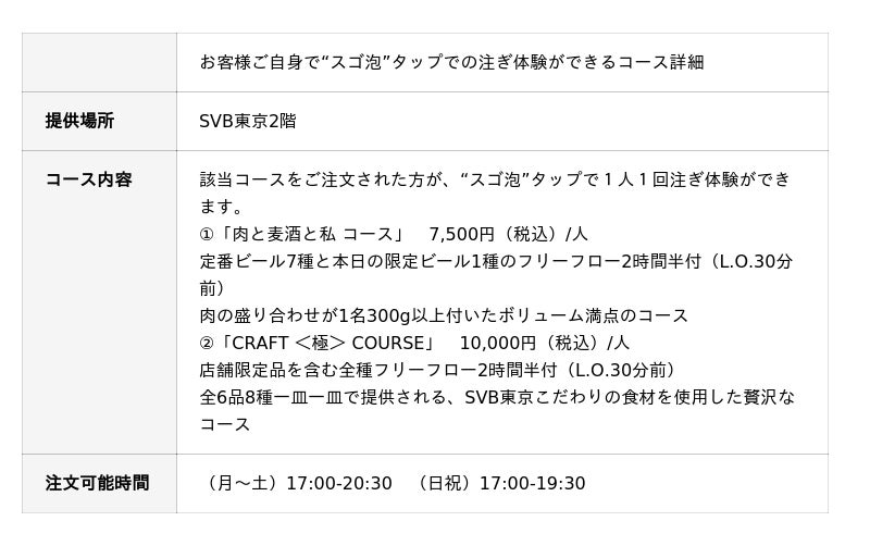 進化版タップでの提供は、2025年11月25日(火)よりSVB東京・京都両店にて開始します。今までは「SPRING VALLEY BREWERY 豊潤ラガー 496」・「SPRING VALLEY BREWERY シルクエール 白」のみ“スゴ泡”注ぎで提供していましたが、今後は季節のテーマに合わせた1液種も追加で“スゴ泡”注ぎでの提供になります。また、SVB東京2階限定では、お客様ご自身で“スゴ泡”タップでの注ぎ体験ができるコースを同日より開始します。