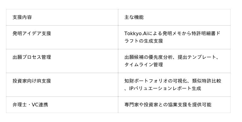 本パッケージは、リーガルテック社の特許AIツール「Tokkyo.Ai」を中核に、知財の創出から活用までを一気通貫で支援するものである。