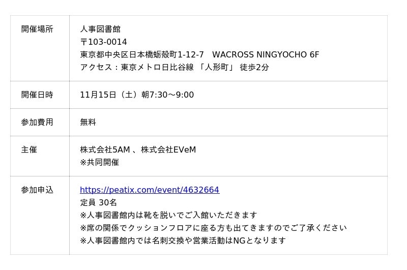 朝活のプロ 『5時こーじ』(株式会社5AM代表) が共同開催する朝活コミュニティ「人事の週末朝ゼミ」にて特別トークセッションに登壇いたします。