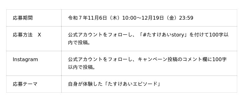 「たすけあいstoryプロジェクト」では、令和7年10月31日(金)までキャンペーン特設Webサイトにて「たすけあい」を感じた瞬間やみんなに伝えたい、実際にあった「たすけあいエピソード」の応募を受け付けてきました。今回、より多くの方に気軽にご参加いただき、より「たすけあい」が広がるようにという思いから、第二弾として、新たにXとInstagramによるSNS投稿型キャンペーンを実施します。自身が体験した「たすけあいエピソード」を100字以内で投稿することで当キャンペーンへの応募が可能です。