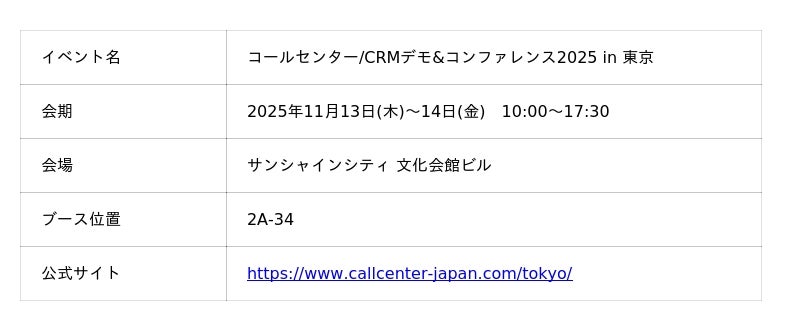 株式会社ラクス(本社:東京都渋谷区、代表取締役:中村 崇則)が提供する問い合わせ自動応対システム「楽楽自動応対」(旧名称:メールディーラー)は、2025年11月13日(木)~14日(金)にサンシャインシティ文化会館ビルで開催される「コールセンター/CRMデモ&コンファレンス2025 in 東京」に出展いたします。
