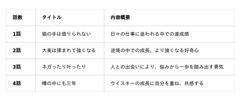 本作では、現代の30歳が直面する様々な場面により、主人公の成長とウイスキーを照らし合わせ、日々の仕事の中でも人が“熟成”していく様を描いています。