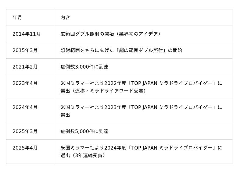 当院は2014年の開院以来、院長自らが考案した「超広範囲ダブル照射」方式を導入し、10年にわたり高い治療効果と患者満足度を追求してきました。