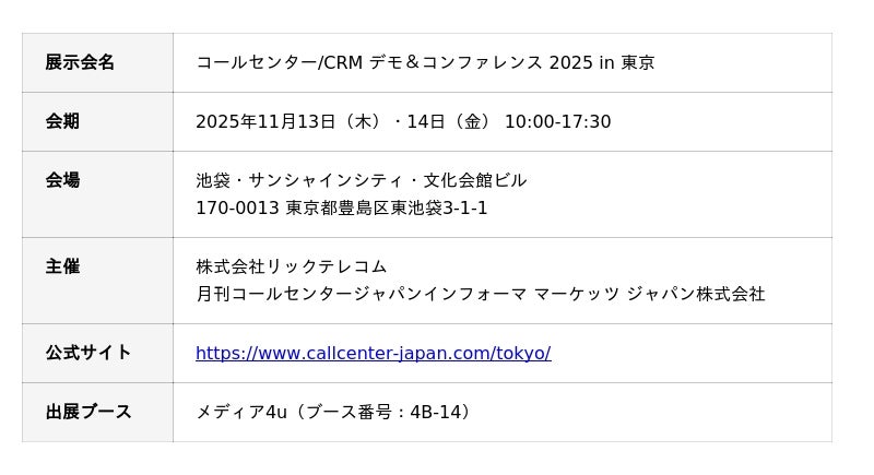 メディア4u、「コールセンター/CRM デモ&コンファレンス 2025 in 東京」に出展