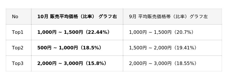 1,000円 ~ 3,000円の1商品あたりの価格帯が売れ筋ラインである点は、TikTok Shopローンチ直後の7月より変化はなし。 10月は500-1000円単価ラインの販売比率が大きく上昇(Top2)。