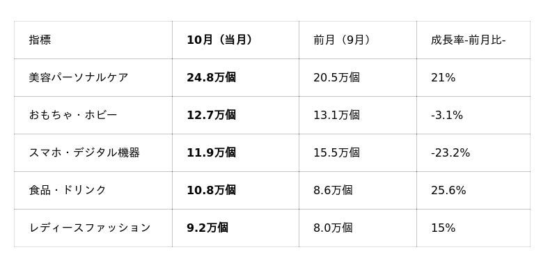 10月の商品カテゴリー別販売数量傾向としては、「美容パーソナルケア」が引き続き+21%と高い成長率がを維持しています。一方で、「スマホ・デジタル機器」は-23.2%減少となり、カテゴリTop2→Top3へ下がりました。また、 「食品・ドリンク(+25.6%)」 「レディースファッション(+15%)」はいずれも成長が続いています。食品は、生鮮冷凍食品等の販売解禁された分が高成長率要因の1つとして推定されます。