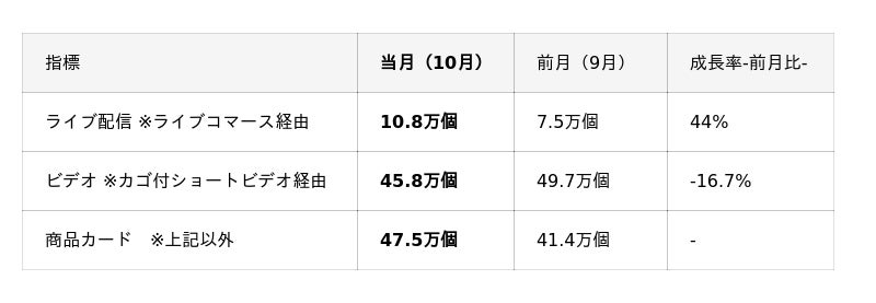 市場全体では引き続き「ビデオ(カゴ付ショートビデオ)」が販売主戦場となっているものの、10月でライブ配信数量が前月比44%と大きく増加へ。