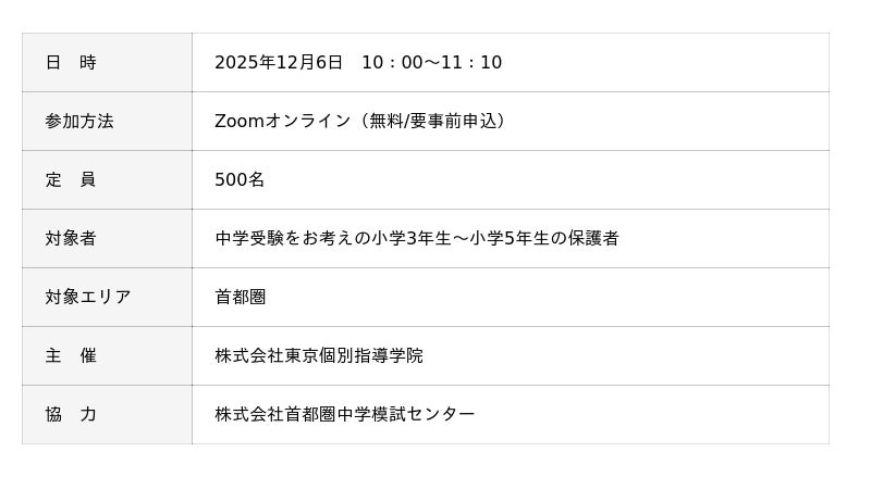 個別指導塾のパイオニアとして日本全国に272拠点(2025年4月1日時点)を展開するベネッセグループの株式会社東京個別指導学院(本社:東京都新宿区、代表取締役社長:松尾 茂樹)は、来る12月6日(土)、中学受験保護者セミナーをオンラインで実施いたします。当社にお通いのお客様に限らず、中学受験をお考えの小学3年生~5年生の保護者ならどなたでもご参加いただけます。対象エリアは首都圏で、定員500名の事前申し込み制となります。