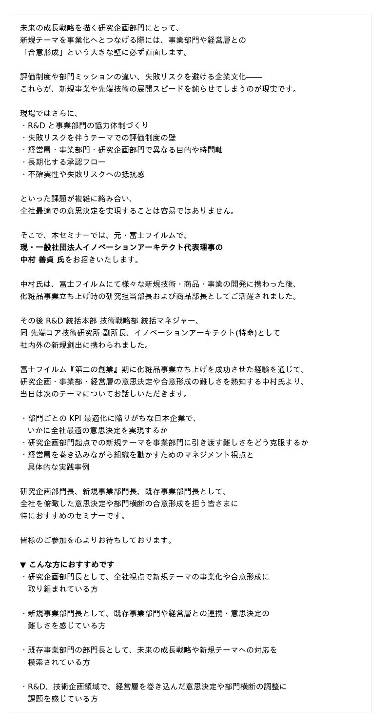 タイトル:成長戦略を実現する合意形成の実践知 ~富士フイルム第二の創業を支えた中村氏が語る、部門長が今押さえるべき視点~