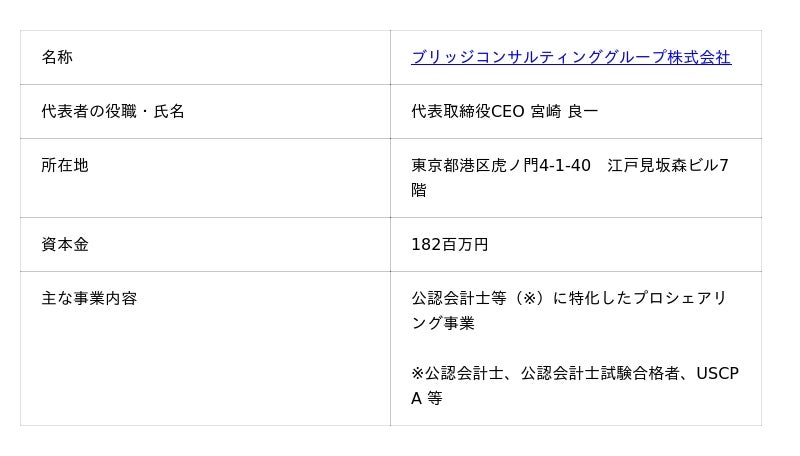 ブリッジコンサルティンググループ株式会社(本社:東京都港区、代表取締役CEO:宮崎良一、東証グロース:証券コード9225、以下「当社」)は、中堅・中小企業への経営コンサルティング事業を強みとする株式会社船井総研ホールディングス(本社:東京都中央区、代表取締役社長 グループ CEO:中谷貴之、東証プライム:証券コード9757)の連結子会社である株式会社船井総合研究所(本社:東京都中央区、代表取締役社長:真貝大介、以下 「船井総合研究所」)と、売上100億円を目指す上場企業の経営課題解決を目的とした業務連携を11月1日から開始したことをお知らせいたします。