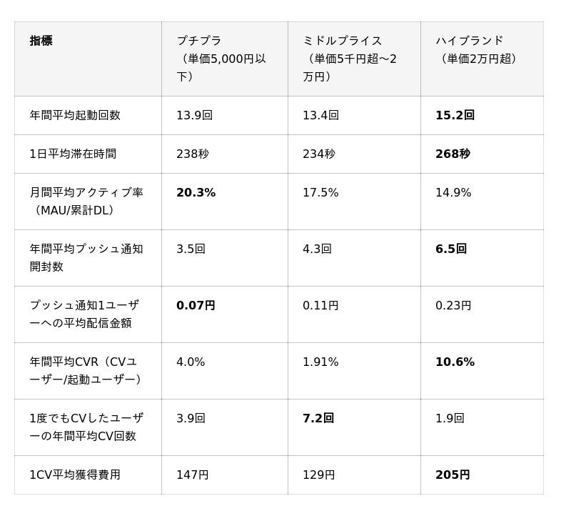 - ハイブランド:月に1回以上の「起動」、1度でも起動すれば10人に1人がCV。ハイブランドでは、**年間平均起動回数15.2回**、**プッシュ通知閲覧回数6.5回**、**平均滞在時間268秒**と他価格帯と比較して最も高く、平均月1回以上、1回あたり4分以上アプリを開き、その半分近くはプッシュ通知経由で開いていることがわかります。価格帯が高いため購入頻度は低いものの、アプリを起動したユーザーの約10人に1人が年間で一度はCVに至るという、高いブランド接触頻度と購買率が特長です。- ミドルプライス:年7回のCVを最も効率的に獲得。1度CVしたユーザーの年間平均CV回数が7.2回と、全価格帯で最もリピーターが多い結果となりました。また、「CV獲得費用」も129円と最も低く、効率的なCV獲得を実現しています。一方、「起動したユーザーの年間平均CVR」は1.91%と最も低いことから、コアなリピーターがCV数を支え、アプリ起動はするものの購入に至らないライトユーザーも共存していることが分かります。アプリはライトファンをコアファンへと引き上げる役割も担い、幅広い施策が求められます。- プチプラ:アクティブ率が最も高く、安価にプッシュ通知配信。「月間アクティブ率」が20.3%と他価格帯と比べ最も高い水準であり、アプリがユーザーの生活に深く浸透しています。また「1プッシュ通知配信金額」は0.07円と最も安価であり、低コストで広範囲の顧客との関係構築・維持を実現していることが特長です。