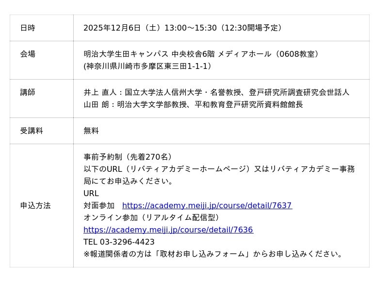 明治大学の生涯学習機関「明治大学リバティアカデミー」は、12月6日(土)に公開講座「1945年:本土決戦体制の下での登戸研究所~秘密戦機関の長野移転の意図と『遊撃戦』準備の実態~」を明治大学生田キャンパスでの対面およびオンラインで開催します。事前予約制で、参加費は無料です。