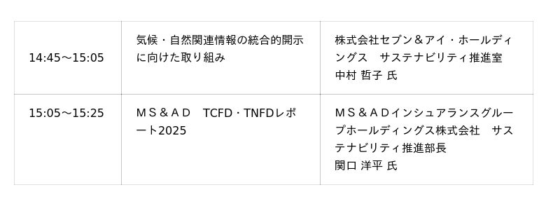 本シンポジウムでは、サステナビリティ基準委員会(SSBJ)が 2025 年 3 月に公表したサステナビリティ開示基準や、保証基準に関する動向などについての基調講演をはじめ、SSBJ 基準を見据えた情報開示に関する企業の取組や、TCFD(気候関連財務情報開示タスクフォース)と TNFD(自然関連財務情報開示タスクフォース)を統合的に開示している企業の開示事例のご紹介などを予定しています。また、パネルディスカッションでは、「サステナビリティ情報開示と企業価値向上に向けて」 をテーマに登壇者を交えて議論します。