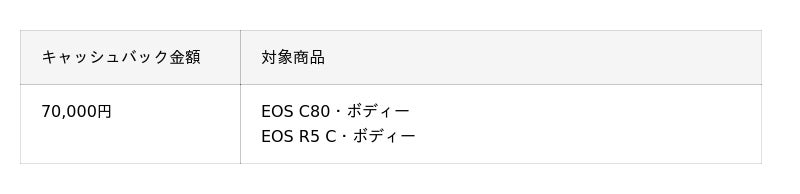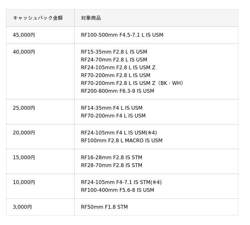 - 対象購入期間:2025年11月14日(金)~2026年1月14日(水)- 応募締切:2026年1月28日(水)※当日消印有効- キャンペーンサイト:canon.jp/camera-cp- キャンペーン内容:期間中に対象商品を購入し応募した方全員(※2)にキャッシュバック(※1)。※1 銀行振り込みによる※2 本キャンペーンへの応募は、お一人様につき各機種の対象商品(キットや色違いの商品を含む)いずれか1台限りです。- 対象商品とキャッシュバック金額: