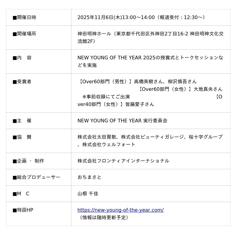 NEW YOUNG OF THE YEAR 実行委員会(総合プロデューサー:おちまさと/運営:株)フロンティアインターナショナル)は、“年齢に関係なく前向きに人生を愉しんでいる人”にフォーカスをあて、高齢化先進国の日本から「新しい若さ」を発信することで、世界に活気ある社会を広げていくことを願い、「NEW YOUNG OF THE YEAR」を始動。