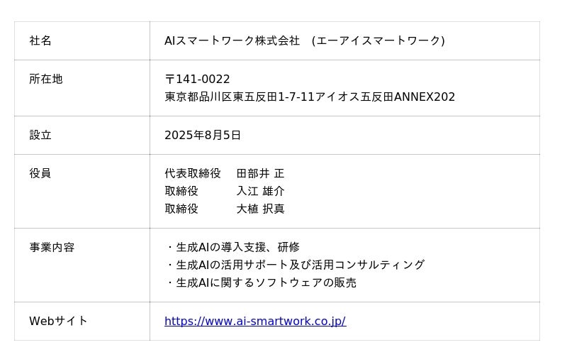 コクー株式会社(本社:東京都千代田区、代表取締役CEO:入江 雄介、以下コクー)と株式会社エクサウィザーズ(本社:東京都港区、代表取締役社長CEO:春田 真、以下エクサウィザーズ)は、共同出資により2025年8月5日に設立した「AIスマートワーク株式会社」が、この度、生成AIの活用支援事業を開始しましたので、お知らせいたします。