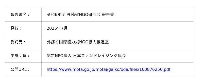 認定特定非営利活動法人 日本ファンドレイジング協会(代表理事:鵜尾雅隆、以下「当協会」)は、外務省より「令和6年度 NGO研究会」における調査研究業務の委託を受け、「新しい開発協力大綱を踏まえた国際協力NGOのファンドレイジング力の強化と、国際協力NGOを取り巻くエコシステムの拡大戦略」に関する報告書を取りまとめました。