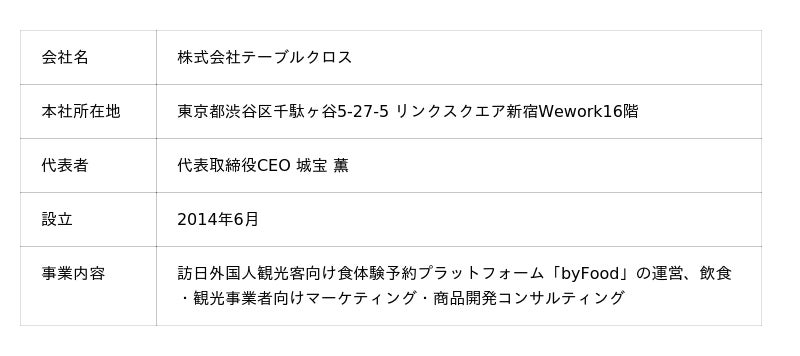 大阪ガス株式会社(代表取締役社長 藤原 正隆、以下「大阪ガス」)と株式会社テーブルクロス(代表取締役CEO 城宝 薫、以下「テーブルクロス」)は、訪日外国人向け料理体験プログラムの提供を目的に、「食に関するインバウンド需要を取り込むビジネス構築支援」に関する業務委託契約を締結し、連携(以下「本連携」)を開始しました。