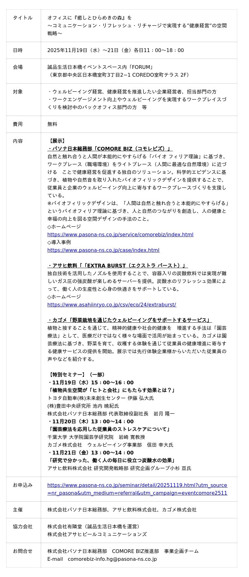 株式会社パソナ日本総務部(本社:大阪市中央区、代表取締役社長 佐野克也)は、アサヒ飲料株式会社(以下、アサヒ飲料)、カゴメ株式会社(以下、カゴメ)と共に、健康経営やウェルビーイング向上に寄与するオフィスの体験型イベント『オフィスに「癒しとひらめきの森」を~コミュニケーション・ リフレッシュ・リチャージで実現する”健康経営”の空間戦略~』を、2025年11月19日(水)から21日(金)まで、COREDO室町テラス 誠品生活日本橋イベントスペース内「FORUM」にて開催いたします。