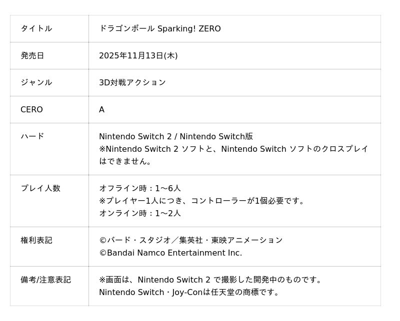 Nintendo Switch 2 /Nintendo Switch 版 「ドラゴンボール Sparking! ZERO」につきまして、