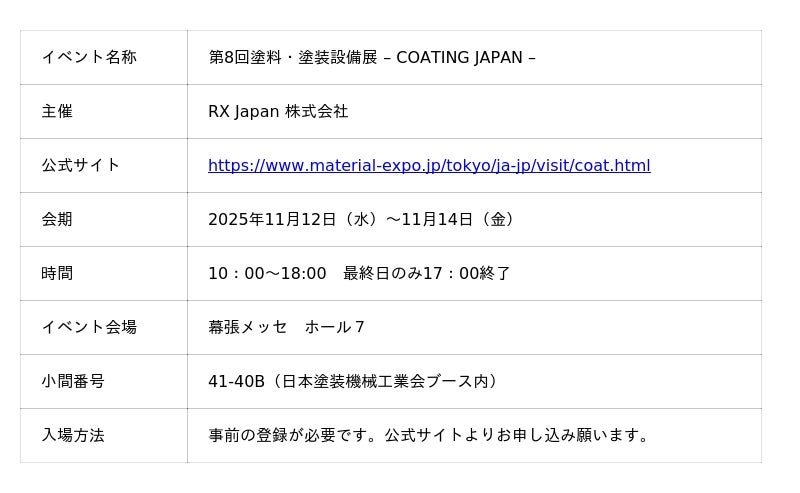 【11月12日(水)~14日(金)】「第8回 塗料・塗装設備展 - COATING JAPAN」出展のお知らせ