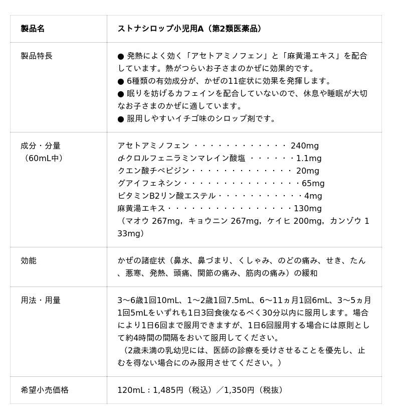 このたび新発売しました「ストナシロップ小児用A」は、3か月のお子さまから服用できるお子さま向けのかぜ薬です。本製品は、6種類の有効成分を配合しており、発熱、咳、鼻水、のどの痛みなどかぜの11症状に効果を発揮します。特に発熱に対しては、解熱鎮痛成分「アセトアミノフェン」と、発熱時の発汗を促すことで発熱を緩和する漢方薬「麻黄湯エキス」を配合しています。また、カフェインを配合していないため、服用後の休息や睡眠を妨げることなく、かぜの回復を促す環境づくりに配慮した処方設計となっています。