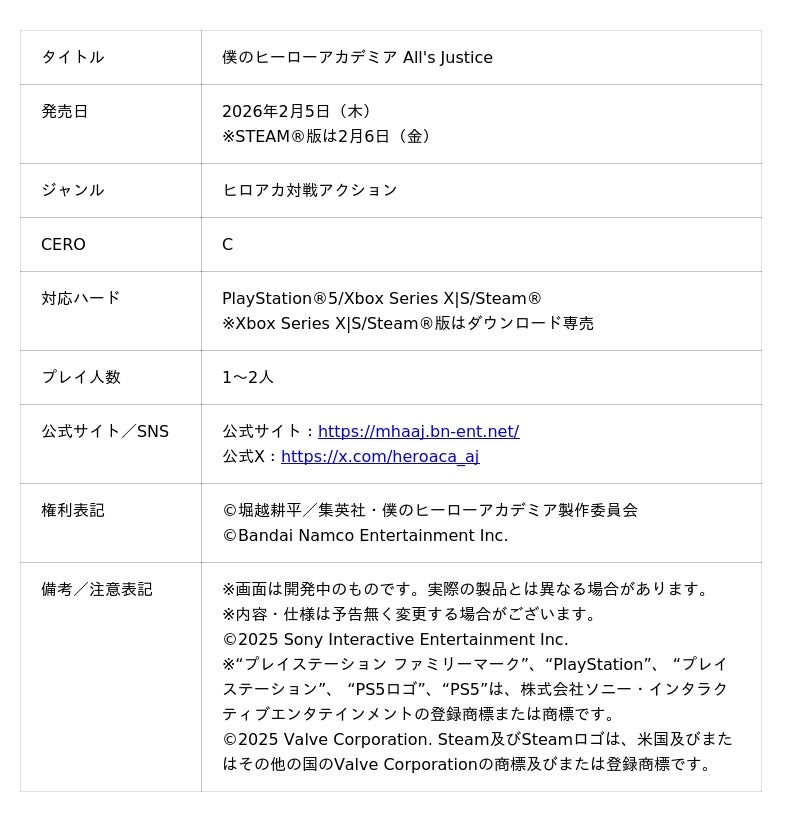 2025年12月20日(土)~21日(日)に開催予定の「ジャンプフェスタ2026」、バンダイナムコエンターテインメントブース(幕張メッセ 展示ホール5)にて、「僕のヒーローアカデミア All's Justice」の出展が決定いたしました。