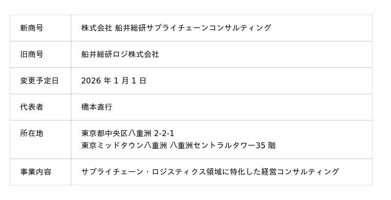 船井総研ロジ株式会社(本社:東京都中央区、代表取締役社長:橋本直行)は、2026年1月1日付で「株式会社 船井総研サプライチェーンコンサルティング」へ社名を変更することをお知らせいたします。