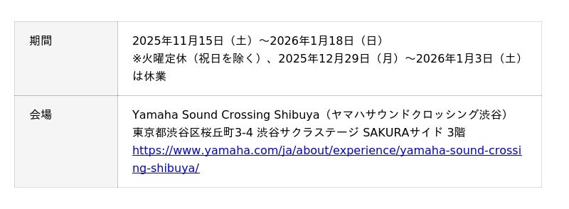 期間:2025年11月15日(土)~2026年1月18日(日)、会場:Yamaha Sound Crossing Shibuya(ヤマハサウンドクロッシング渋谷)
