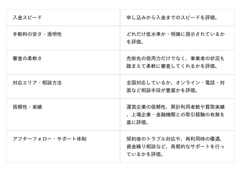 ランキング根拠を掲載。評価基準の透明性を重視し、「資金化スピード」「手数料の明確さ」「信頼性・実績」「利便性」など、指標ごとの強み・弱みを可視化しました。これにより、従来の資金調達手段一覧では見えづらかった実務上のリアルな評価を、ユーザー目線で提供しています。