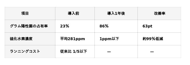これにより、薬剤・電力を使わず、自然の力で硫化水素の発生を根本から防止できます。