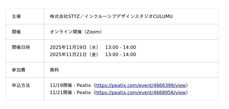 インクルーシブデザインスタジオCULUMU(運営:株式会社STYZ、本社:東京都渋谷区、代表取締役:田中辰也、以下「CULUMU」)は、オンラインセミナーを2025年11月19日(水)13時、そして2025年11月21日(金)13時から開催します。