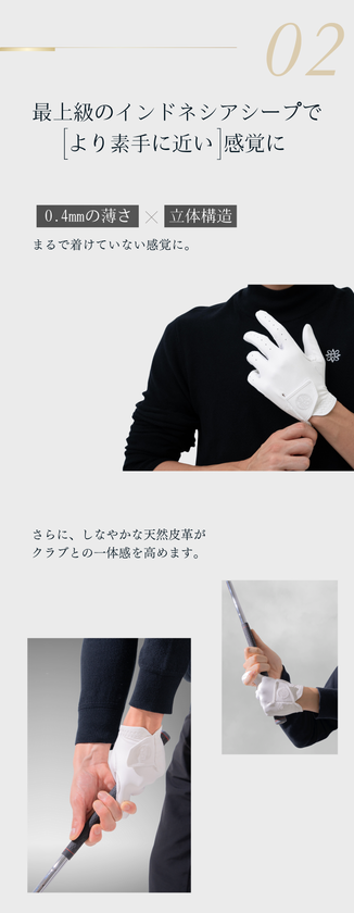 創業68年の手袋製造技術と、エルゴグリップの独自の立体設計を組み合わせることで、天然皮革でありながら抜群のフィット感を実現しています。ゴルフをより楽しんでいただくための、自信作です。」