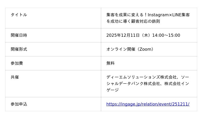 顧客対応クラウド「Re:lation(リレーション)」を提供し、6,000社以上(※1)の導入実績を誇る株式会社インゲージ(本社:大阪府大阪市、代表取締役:和田 哲也、以下インゲージ)は、2025年12月11日(木)に、ディーエムソリューションズ株式会社、ソーシャルデータバンク株式会社と共同で、ウェビナー「集客を成果に変える!Instagram×LINE集客を成功に導く顧客対応の鉄則」を開催することをお知らせします。