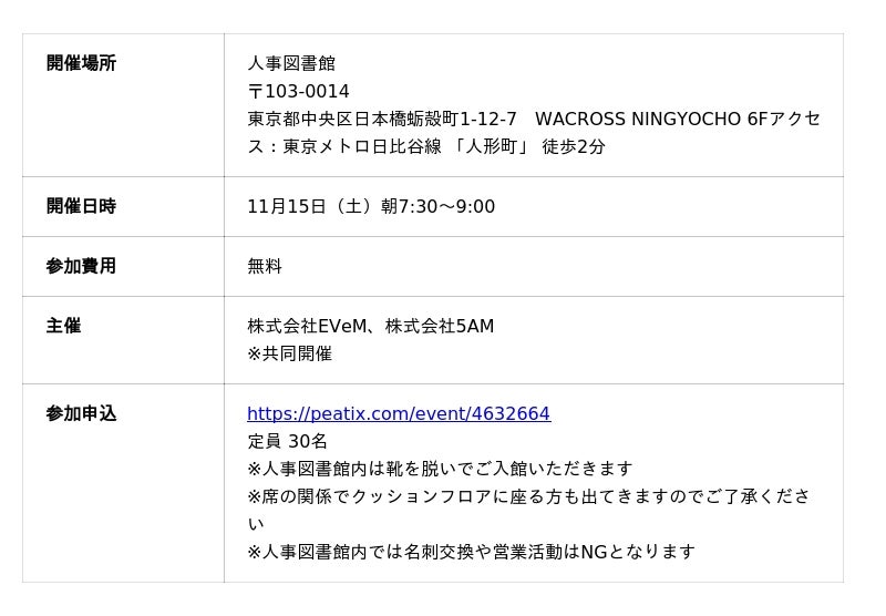 マネージャーイネーブルメントサービスを提供する株式会社EVeM(本社:東京都新宿区、代表取締役:長村 禎庸)は、朝活コミュニティを運営する株式会社5AM(本社:東京都世田谷区、代表取締役:井上 皓史)と共同で、人事向け朝活イベント「人事の週末朝ゼミ」を2025年11月15日(土)に開催いたします。