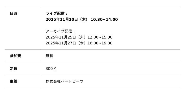 https://prcdn.freetls.fastly.net/release_image/93709/66/93709-66-849cdee98c496d64e1d24ed248cf9a38-297x288.png?width=536&quality=85%2C75&format=jpeg&auto=webp&fit=bounds&bg-color=fff ]【配信者情報】株式会社ハートビーツ