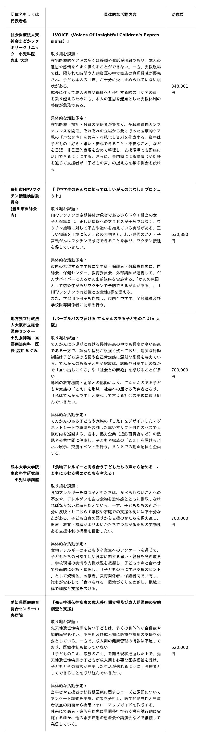 このような助成金支援活動があることを知り申請いたしました。大変勇気づけられました。これからも地域で生活するすべての子どもたちのために、様々なアドボカシー活動に取り組んでいきたいと思いました。仲間の小児科医へも紹介させていただきました。