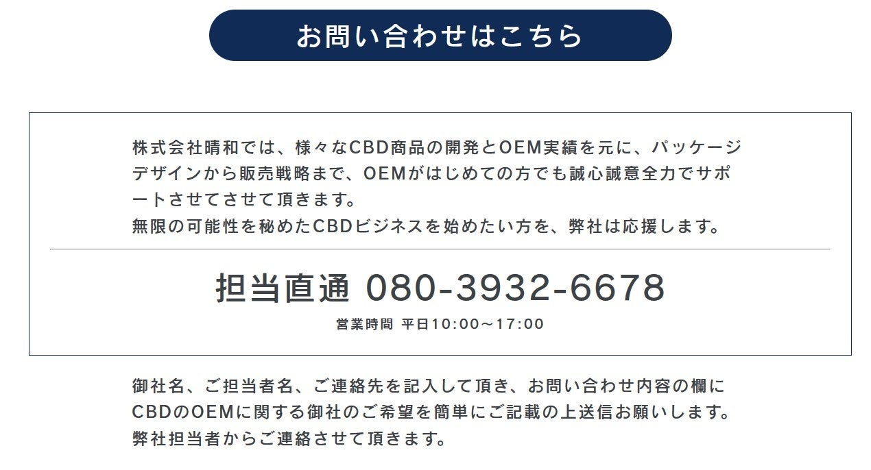 株式会社晴和(以下弊社)はCBD製品のOEMを中心とした事業を数年にわたって運営しており、食用CBDオイル専用工場及びCBD電子タバコの自社工場を国内に完備し、CBD化粧品やCBDサプリメントやCBDグミ等の様々なOEMの実績も多数御座います。