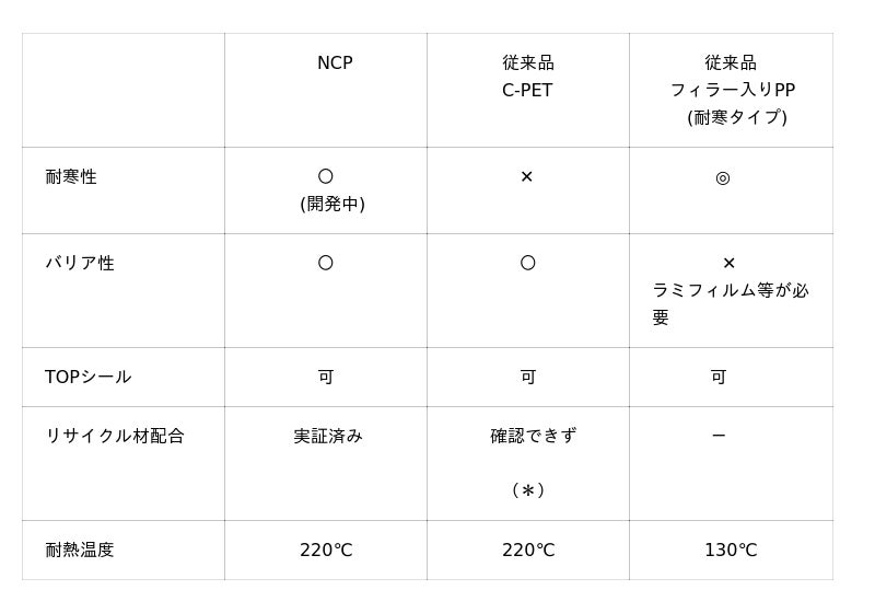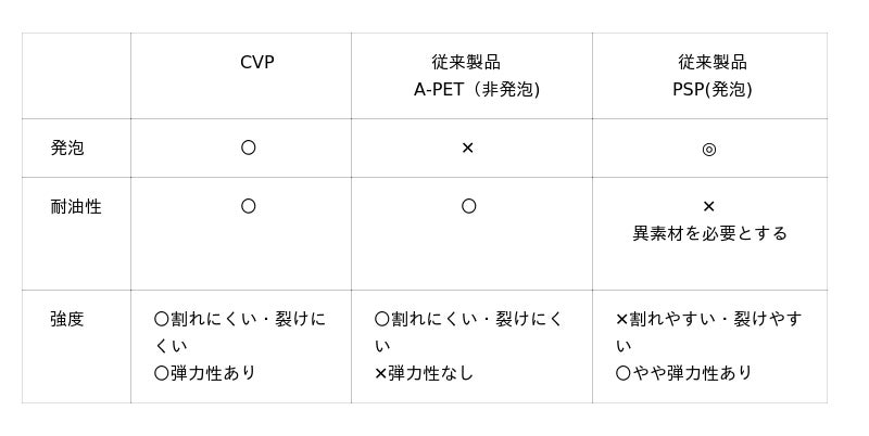 PET素材の持つ「バリア性(酸素等不透過性)」、「耐油性」、「耐衝撃性・引張強伸・突き刺し強度」を共通の特長として、発泡体素材(名称:CVP)と、従来品より耐寒性を向上させた新型C-PET(名称:NCP)の2種を開発しました。