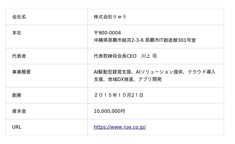 りゅうは創業以来、沖縄を拠点にアプリ開発を提供し、多様な業種のDXを支援した実績を踏まえ、今後は経営支援から現場導入まで、多面的なAIサービス展開に取り組んでまいります。