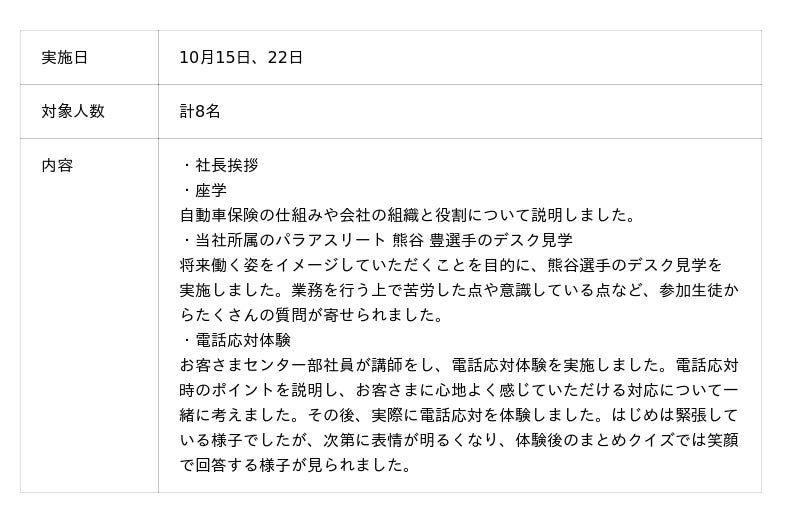 当日は、社長挨拶後、自動車保険の仕組みや会社の組織と役割について説明し、当社所属のパラアスリートである熊谷選手のデスク見学を行いました。また、電話応対体験を通じて、お客さまに心地よく感じていただける対応について一緒に考えました。