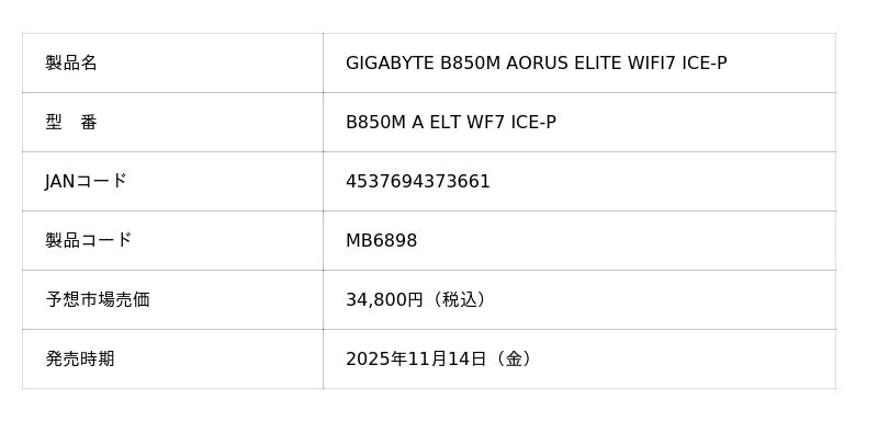 株式会社ニューエックス(本社:東京都千代田区)は、取り扱いメーカーであるGIGABYTE社より、AMD B850 チップセットを搭載した神鷹凛 (かみたか・りん) キャラクターモデルのマザーボード新製品の「GIGABYTE B850M AORUS ELITE WIFI7 ICE-P」を2025年11月14日(金)に発売いたします。