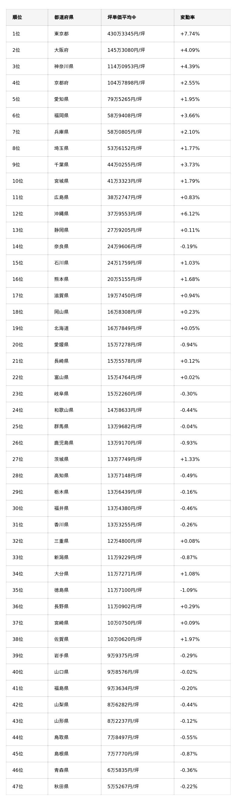 一方で、最下位に位置する秋田県は約5万円です。秋田県と比べると東京都の坪単価平均は86倍もの高さなのです。