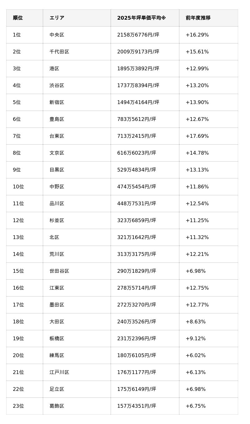 東京都23区のどのエリアを選んだとしても、全国トップクラスの高さであることは変わりません。