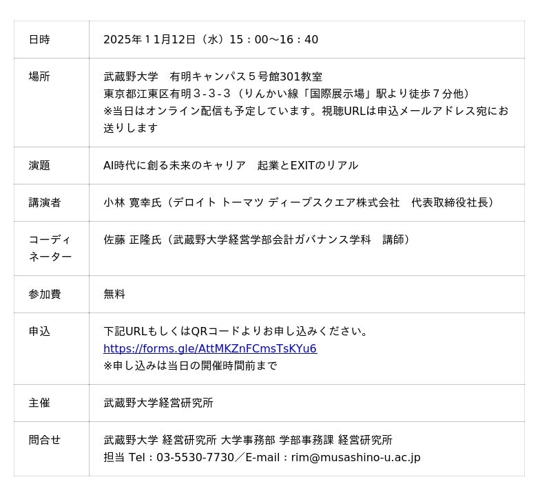 武蔵野大学経営研究所(所長:古川 一郎)は11月12日(水)に武蔵野大学有明キャンパス5号館でシンポジウム『AI時代に創る未来のキャリア 起業とEXITのリアル』を開催します。